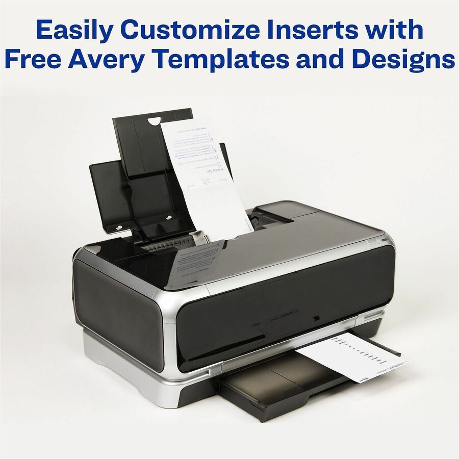 | Marketing Information | Precut plastic tabs with inserts can be typed, handwritten or printed with inkjet or laser printers. Feed 4" x 10" sheets through envelope feeder on printer and then separate individual tabs. Adhesive is permanent. Avery offers many easy-to-use templates for Microsoft Word and other popular software programs. Each index tab offers a 1/3" tab extension. |