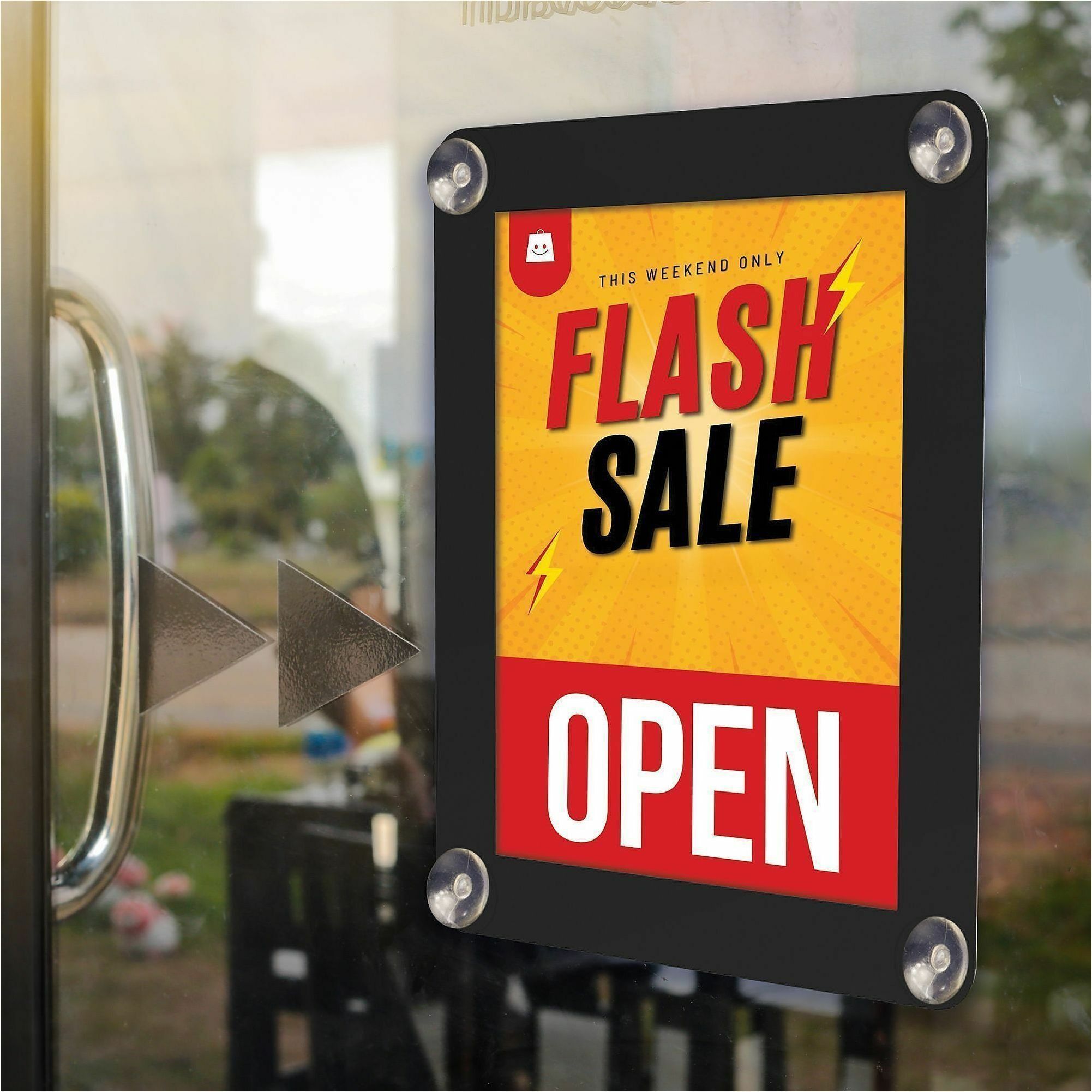 | Marketing Information | Double-sided Window Display easily mounts to glass, doors and walls in vertical or horizontal position. Letter-size inserts slide in and out. Clear plastic protects and keeps message visible. Plastic construction is heat-resistant and UV-protected. Window display includes four suction cups for mounting. |