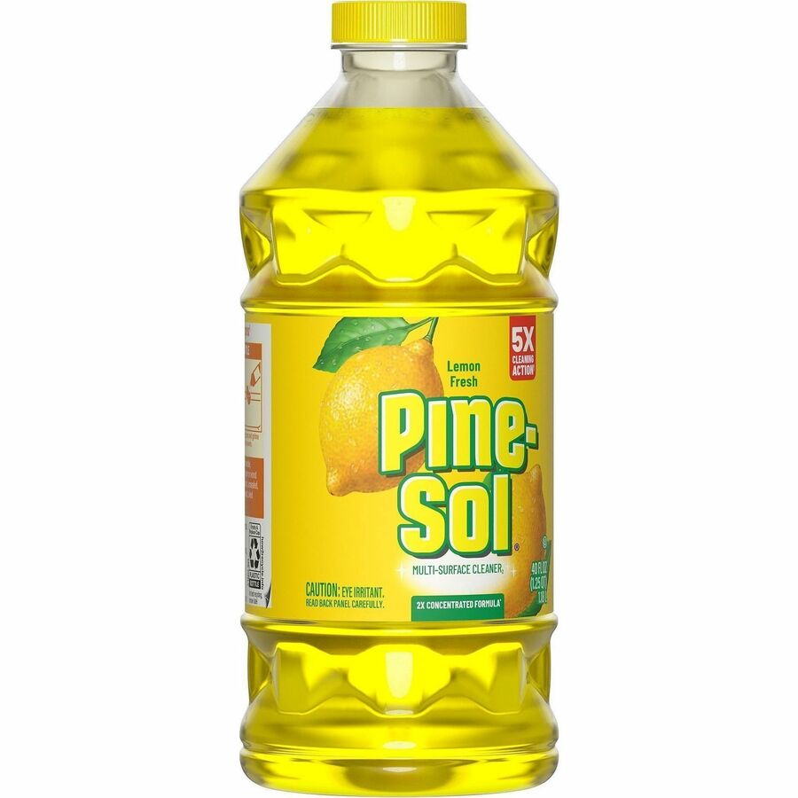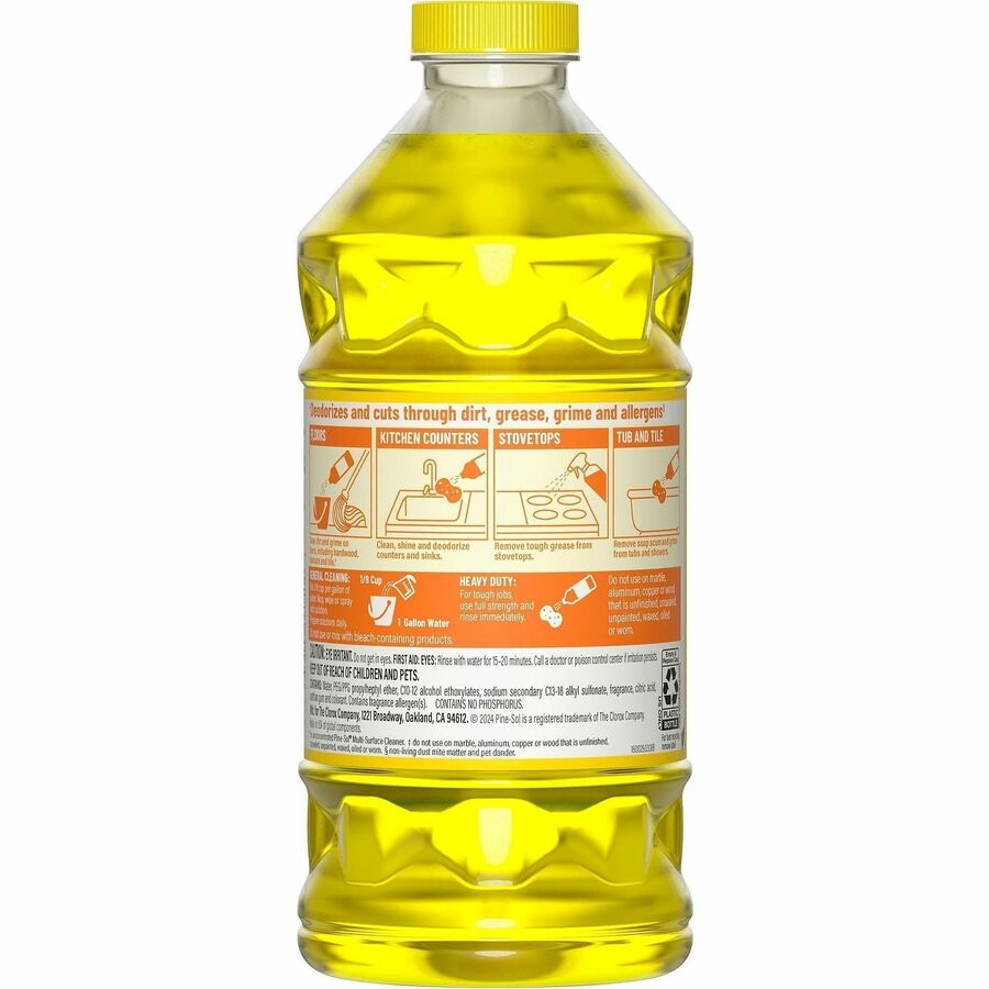 | Marketing Information | With Pine-Sol Multi-Surface Cleaner, you only need one cleaner to fight tough dirt, grease and grime. This twice-concentrated formula delivers more cleaning power per drop and cleans five times better than the previous Pine-Sol Scented Formula This multipurpose cleaner cleans right the first time, removing stains and deodorizing soft surfaces while leaving a lemon fresh scent. This powerful degreaser cuts through grime and soap scum fast and is safe for use on wood, tile, stone, porcelain and glass and more when used as directed on hard, nonporous surfaces. Do not use on marble, aluminum, copper or wood that is unfinished, unsealed, unpainted, waxed, oiled or worn. |